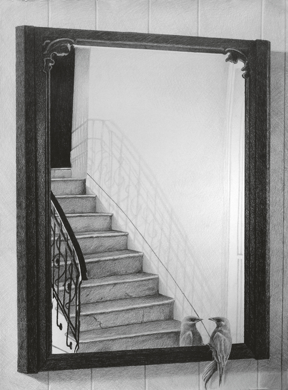 These drawings are part of the series A Casa dos Espelhos and explore the duality that exists in an image when reflected in a mirror and outside of it. This double representation, of the reflected "thing" and its own reflection, is proposed to us here through the complicity between the image stolen by the drawing and the image that the mirror steals, as two forms of imitation.